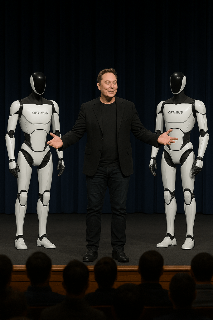Elon Musk with a two Optimus Robots released on the Auditorium