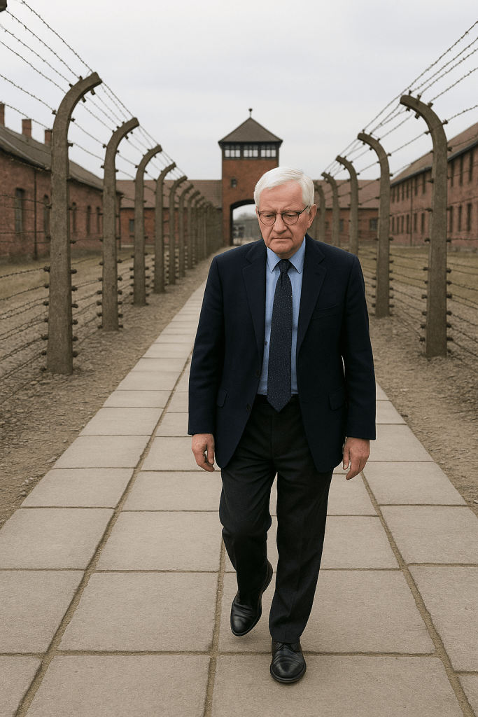 English historian Sir. Richard J. Evan’s walking on Auschwitz’s Birkenau Memorial in Poland